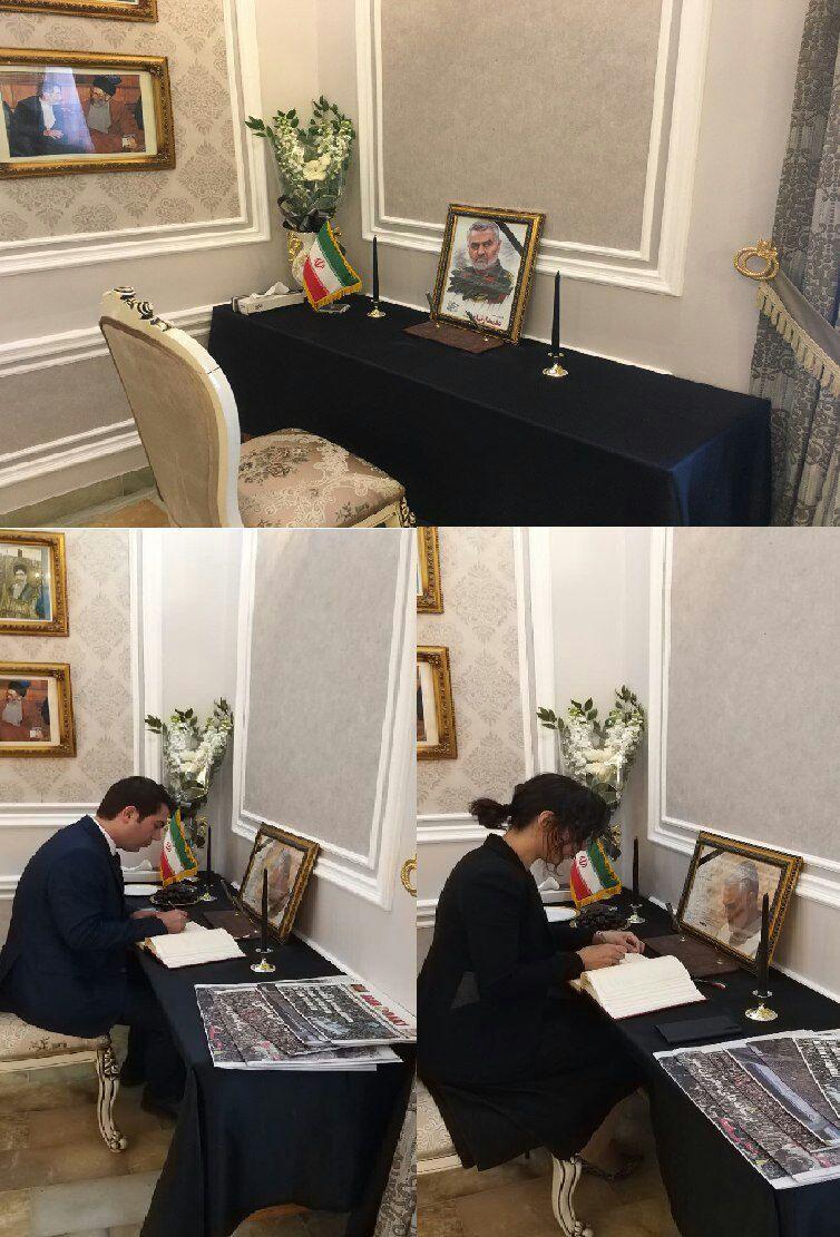 با گشایش دفتر یادبود شهید سپهبد سلیمانی و‌همرزمان شهیدش در محل دفتر نمایندگی ایران در ژنو، شمار زیادی از سفرا، دیپلمات ها و شخصیت های فرهنگی و دانشگاهی با حضور در محل نمایندگی، با ابراز تسلیت به دولت و ملت ایران، دفتر یادبود را امضا کردند.