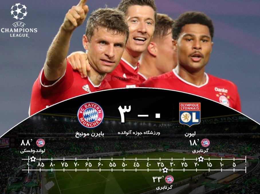 بایرن مونیخ آلمان ۳ - ۰ المپیک لیون فرانسه در استادیوم ژوزه آلوالاده در شهر لیسبون - داور: آنتونیو ماتئو لاهوز از اسپانیا