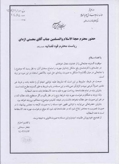 در جلسه‌ای با کارشناسان رفع مشکل زندانیان مهریه، و استماع سخنان آنان، به نظر رسید که موضوع را با جنابعالی در میان بگذارم تا مشکل به صورت ریشه‌ای حل شود. بالخصوص استفاده در این مورد زیاد است.