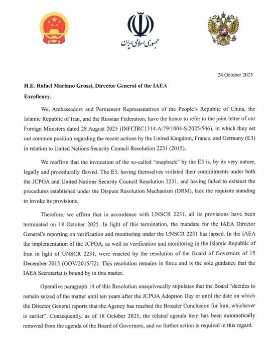 ایران، چین و روسیه در نامه‌ای مشترک به مدیرکل آژانس بین‌المللی انرژی اتمی اعلام کردند که تمام مفاد قطعنامه ۲۲۳۱ از تاریخ ۱۸ اکتبر به پایان رسیده و نیازی به اقدام دیگری در اینباره وجود ندارد.